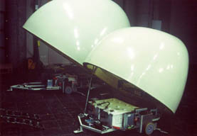 The rolling robots are driven by two electric motors on the outside of their chassis of the type that are normally used for electric wheelchairs. Two auto batteries supply them with energy. Since not all the batteries can be re-charged over night, a special re-charging system has been developed. Robots with weak batteries leave the 4,000 square meter area and roll to a charging station at the side of the Hall. Freshly charged after their "pit-stop", they re-join their flock. |